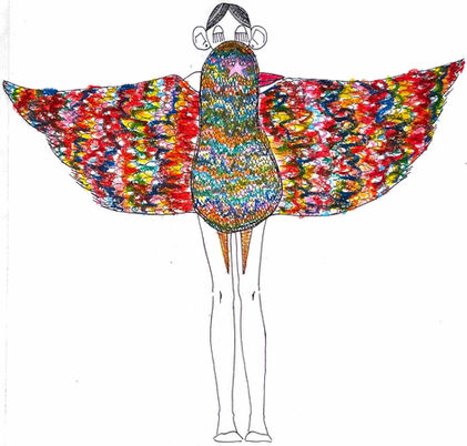 A collection of garment sketches from 2022—present, using a variety of materials from pencil to chalk and oil pastels to markers.